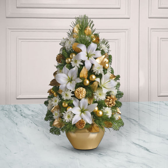 Mini árbol de navidad con lilies, piñas y esferas. Arreglo floral exquisito que destaca la belleza de las lilies. Perfecto para reflejar tu buen gusto y celebrar una navidad especial. Florerías en México.