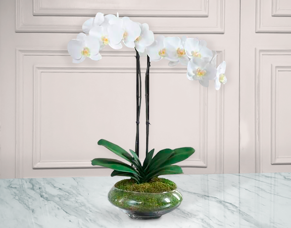 Arreglo floral de orquídeas. En este diseño el cristal destaca la belleza de las orquídeas Phalaenopsis. Envia flores a la Ciudad de México.